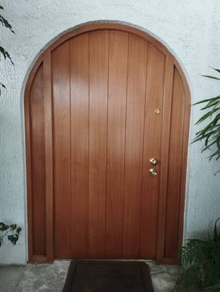 Dado muchos de los nuevos diseños constructivos que han impuesto los arquitectos, con un estilo rústico o campestre, pero con una evidente linea moderna, dentro de las puertas de seguridad más solicitada es este tipo que tiene un evidente estilo más rústico, pero con un fino acabado en que le da un toque más moderno y elegante, en este caso esta puerta aunque está hecha en acero con una plancha frontal, se le ha construido una ventanilla que permite la visión hacia el exterior y decorada con un fina reja de fierro forjado.