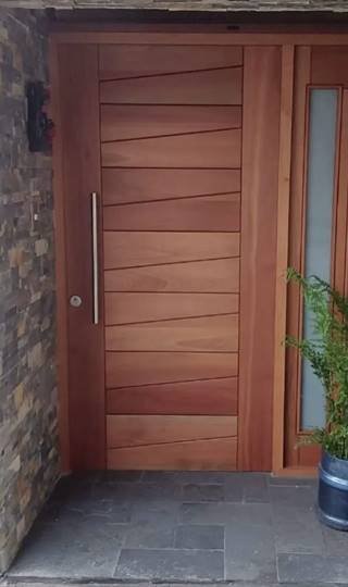 Esta puerta de acero de protección de casas está decorada de tal manera que parezca entablado y barnizada en un tono muy suave para hacer notar el tenue veteado de la madera, además de una decoración de la pequeña ventanilla, la manilla y el pomel en fierro rústico para hacer juego con el estilo de la puerta y la casa.